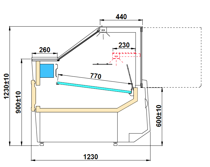 | Optional Extras | 30mm Grey granite worktop (per meter) £160 Moveable partition (low glass on stand) £100 Different front panel colour (per meter) £140 Castors (per meter) £320 Fixed glass partition (high glass on deck) (per meter)£120 Small moveable scale table for scales or cash register £290 230V socket £50 Additional LED light on the front base panel (per meter) £120 |