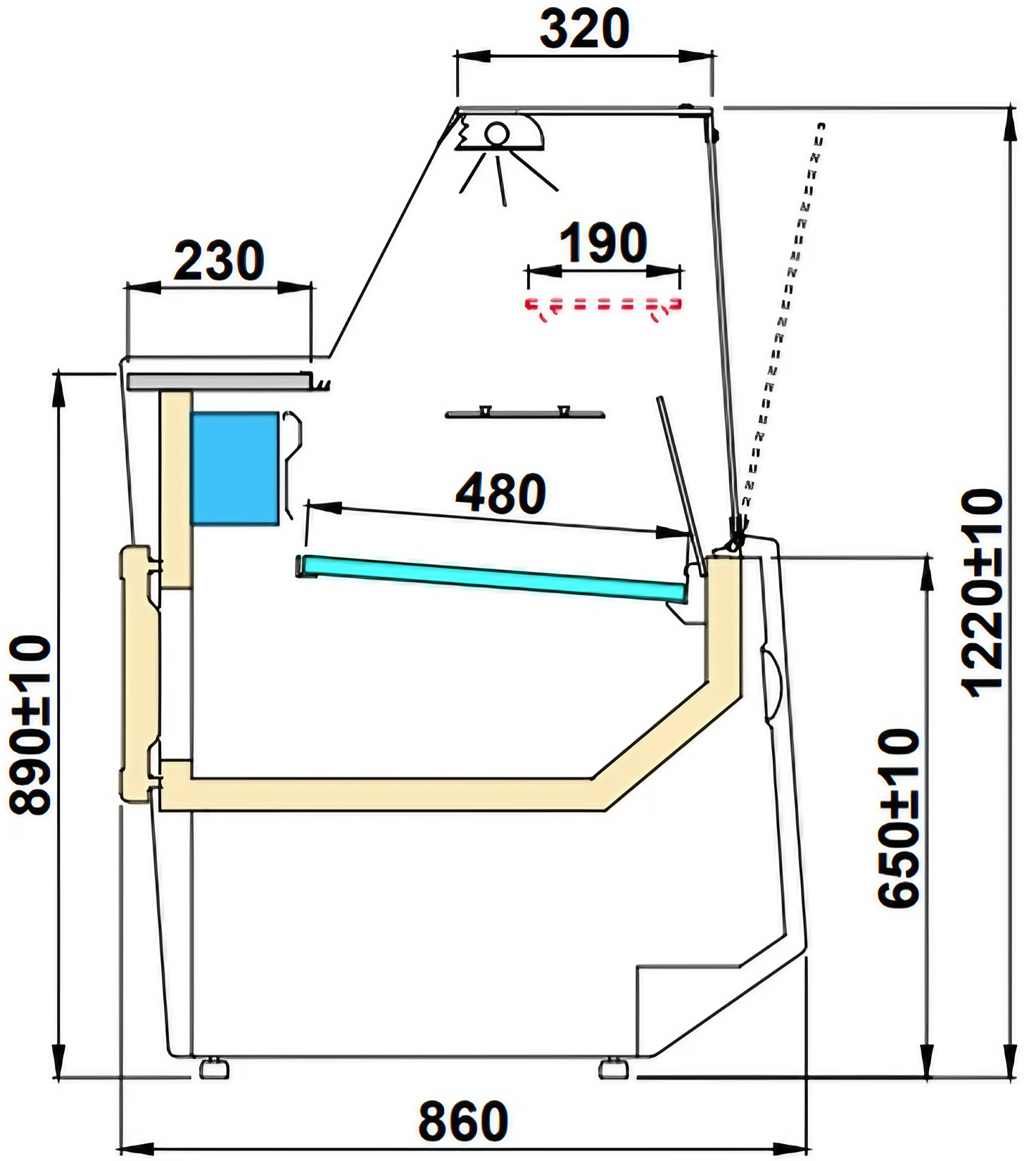 | Optional Extras | 30mm Grey granite worktop (per meter) £160 Moveable partition (low glass on stand) £100 Castors (per meter) £320 Fixed glass partition (display area) £120 Different front panel colour (per meter) £140 Electronic temp, recorder, software & wire £170 230V socket £50 Additional LED light on the front base panel (per meter) £120 Small moveable scale table for scales or cash register £290 |